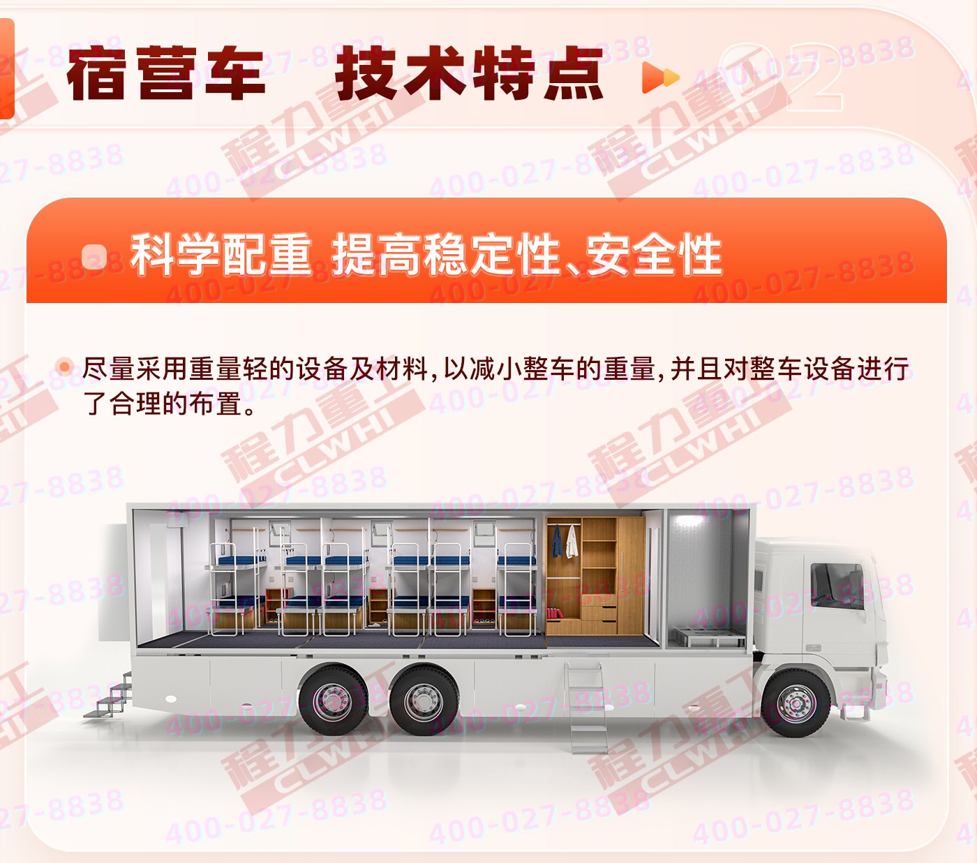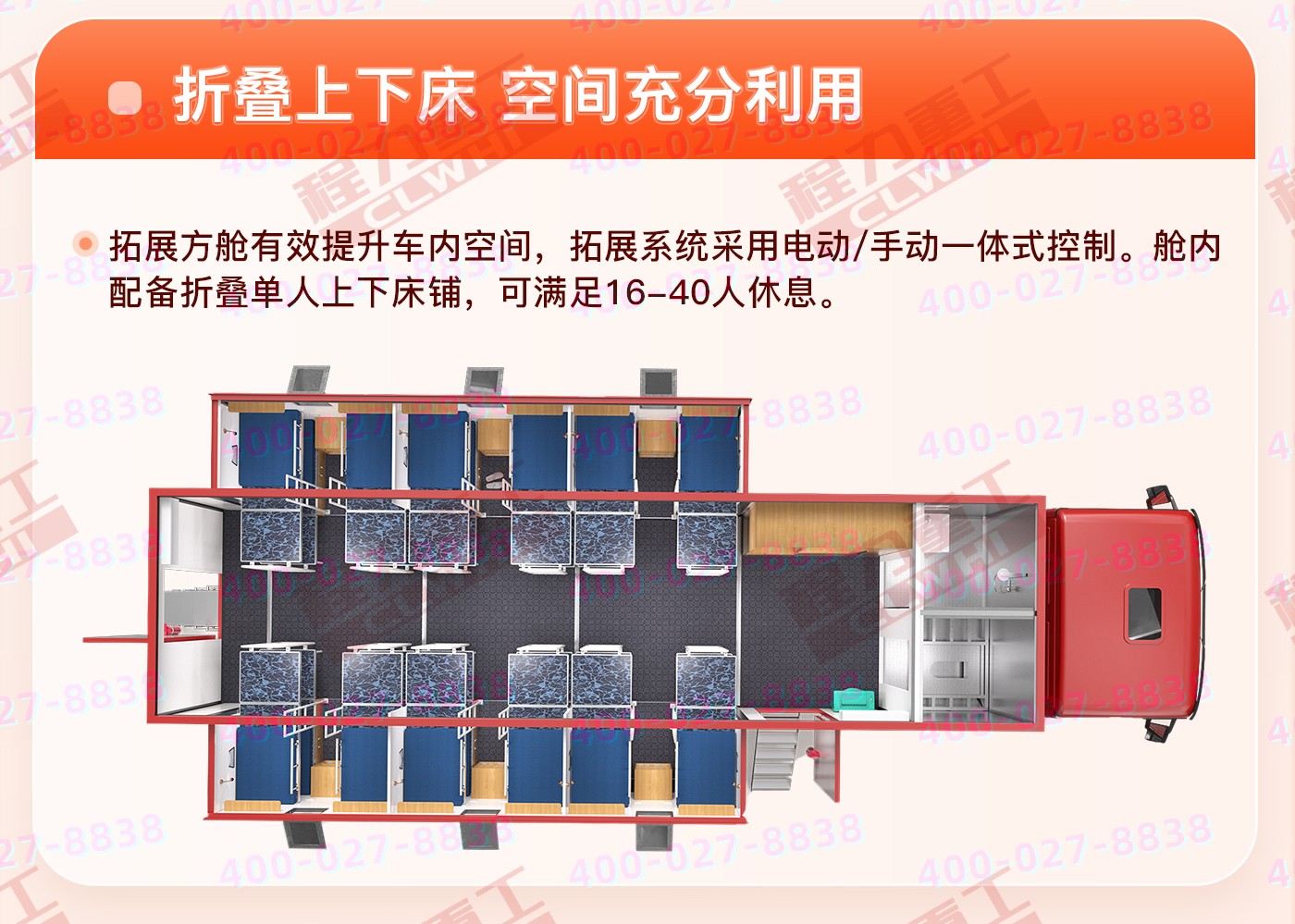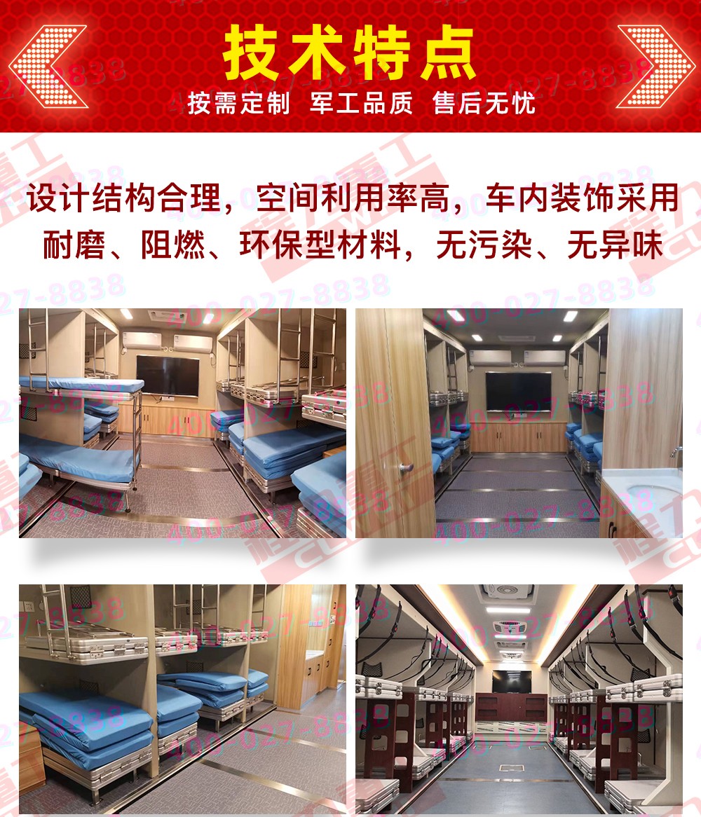 主要專用裝置發(fā)電機,折疊床鋪等,選裝配置衛(wèi)浴間、凈水箱、外掛式空調(diào)、衛(wèi)星天線、吸頂電視、換氣扇、車廂左、右可選裝擴展機構(gòu)箱體、車廂左、右兩側(cè)、后部增加或封閉窗戶、車門、車輛顏色可選裝裝有具有衛(wèi)星定位的行車記錄儀等,不擴展可供8-12住宿,擴展后可供8-28人住宿。(可根據(jù)客戶要求改裝)