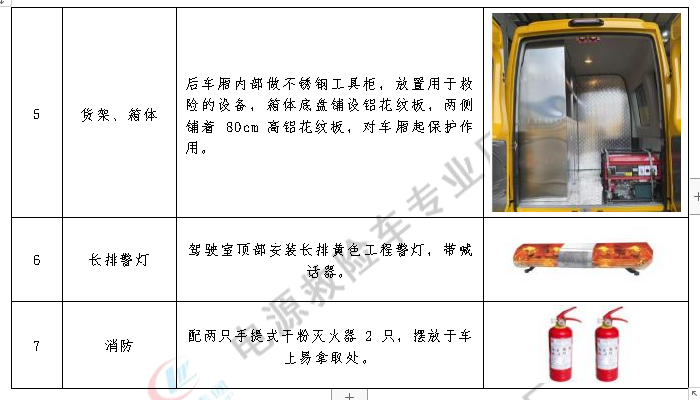 車輛搭載夜間照明燈,監(jiān)控攝像存儲,數(shù)據(jù)傳輸,音像系統(tǒng),氣體防護(hù)設(shè)備,傷員簡單救護(hù),氧氣供應(yīng),擔(dān)架急救和辦公語音調(diào)度等現(xiàn)場作業(yè)設(shè)備。額定載客:4-7人。